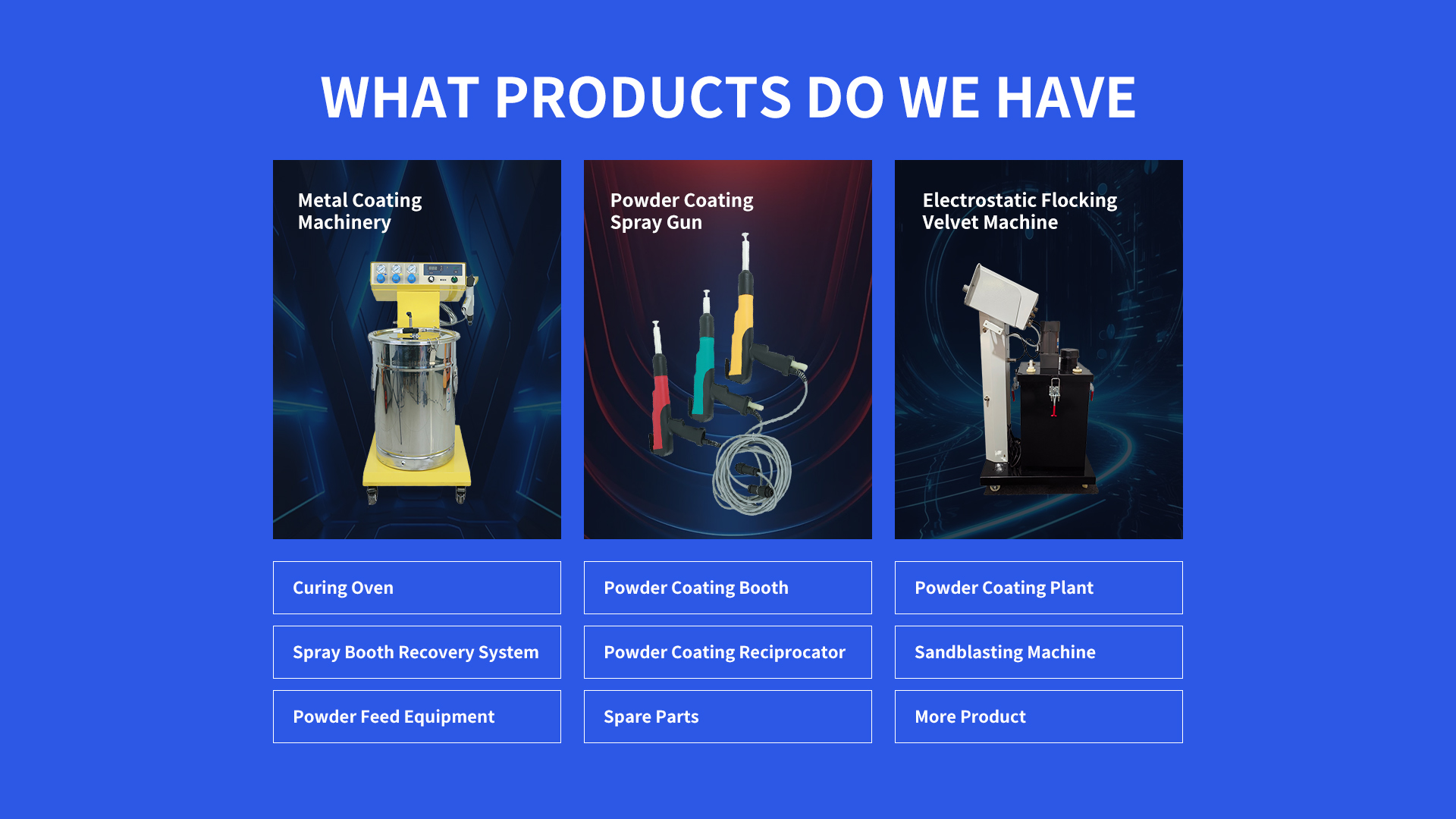 Powder Coating Machine Parts consist of spray guns, powder booths, recovery systems, curing ovens, and conveyors.